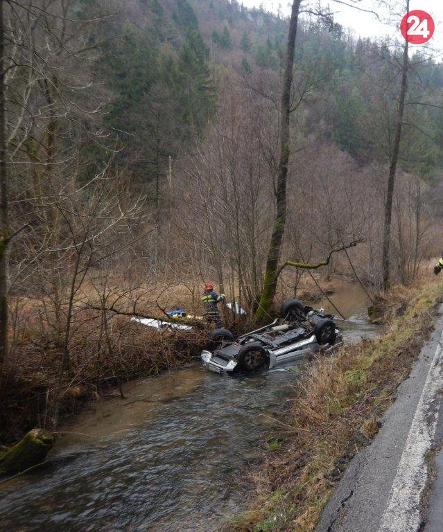 Galéria k článku Auto v potoku a na streche: Policajti takto vysvetľujú okolnosti nehody neďaleko Považskej