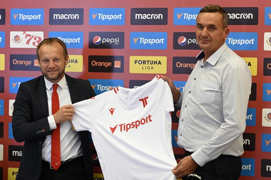 Generálny manažér AS Trenčín Róbert Rybníček pózuje po podpise zmluvy, vpravo predseda predstavenstva Tipsport SK Martin Tabák