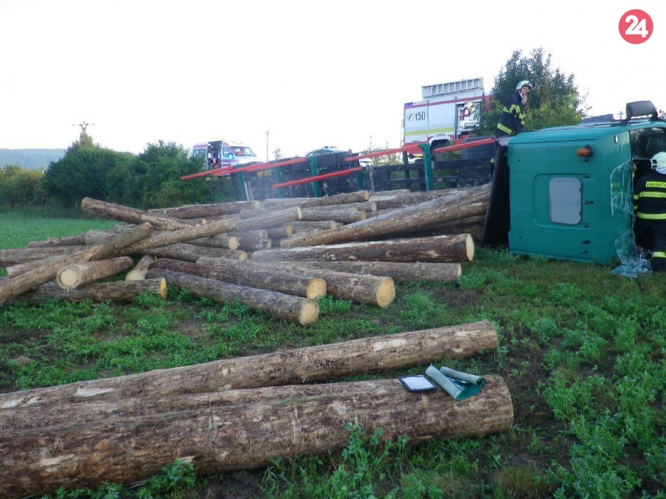 Galéria k článku Prevrátený kamión s drevom: Vodič zostal zakliesnený v kabíne, FOTO