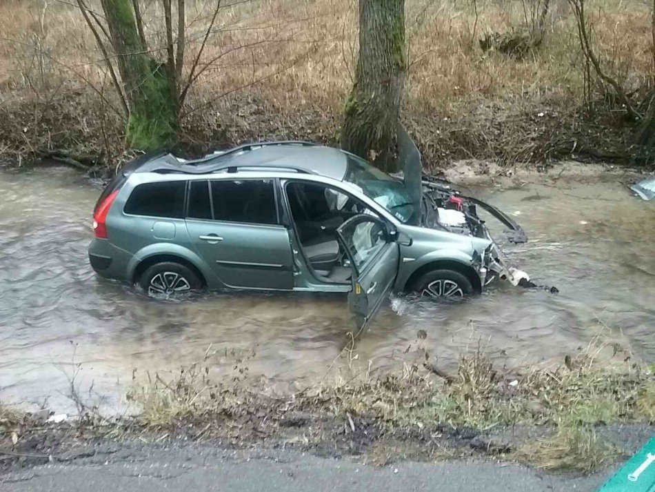 Galéria k článku Auto skončilo v Domanižanke: Na pomoc museli prísť hasiči, FOTO