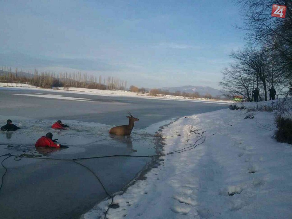 Galéria k článku Kuriózne FOTO zo záchrany jeleňa: Hasiči, palec hore!