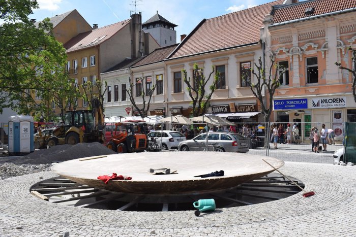 V stredovom ostrovčeku sa ešte minulý týždeň namontovala hlavná, bronzová časť fontány v tváre misy.