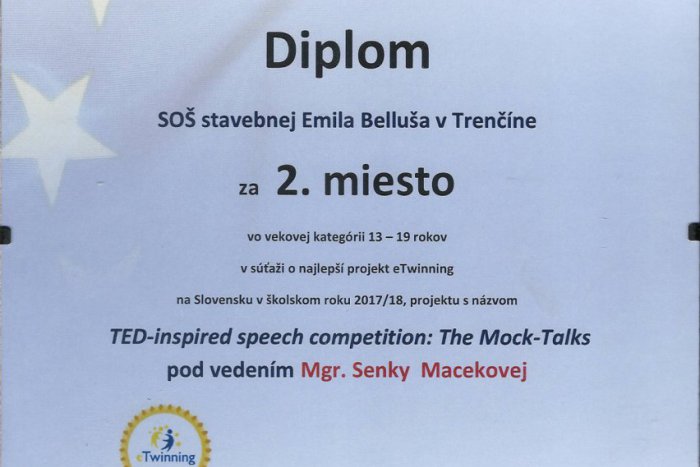 Študenti Strednej odbornej školy stavebnej Emila Belluša v Trenčíne sa pod vedením Senky Macekovej zúčastnili Národnej súťaže eTwinning 2018, v ktorej obsadili v kategórií 13 – 19 rokov striebornú pozíciu. Za svoj projekt s názvom TED-inspired speech competition: The Mock-Talks si v Zážitkovom centre vedy „Aurelium“ v Bratislave koncom júna 2018 spoločne s riaditeľkou školy Martinou Knappovou prevzalo ocenenie 11 najúspešnejších žiakov.